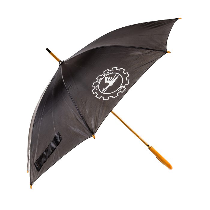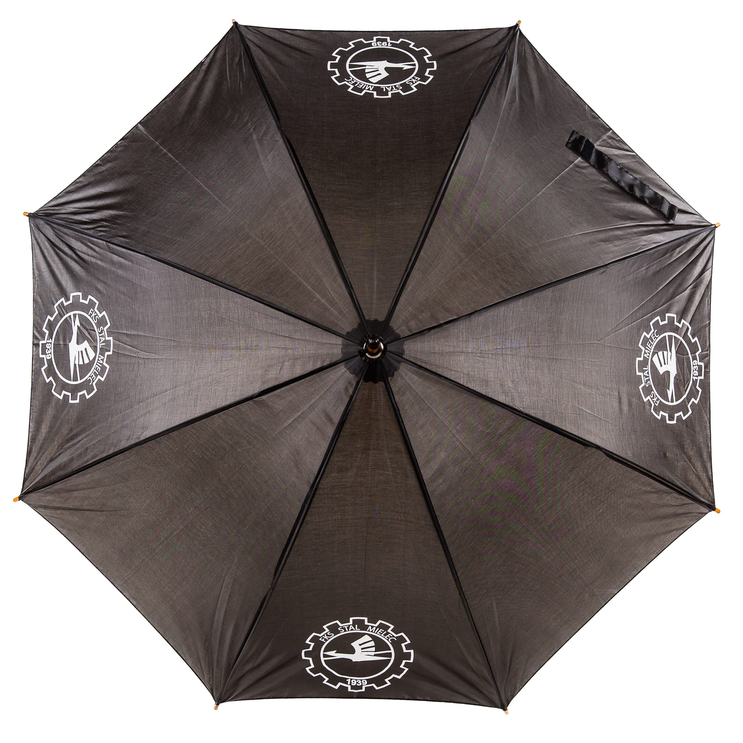 Czarny parasol z logo FKS Stal Mielec. Automatyczny mechanizm otwierania sprawia, że parasol jest niezwykle łatwy w użyciu, a drewniana rączka o długości 88 cm zapewnia komfort podczas noszenia. Po rozłożeniu, parasol ma rozmiar Ø 105 cm, co stanowi wystarczającą przestrzeń, aby skutecznie chronić przed deszczem.