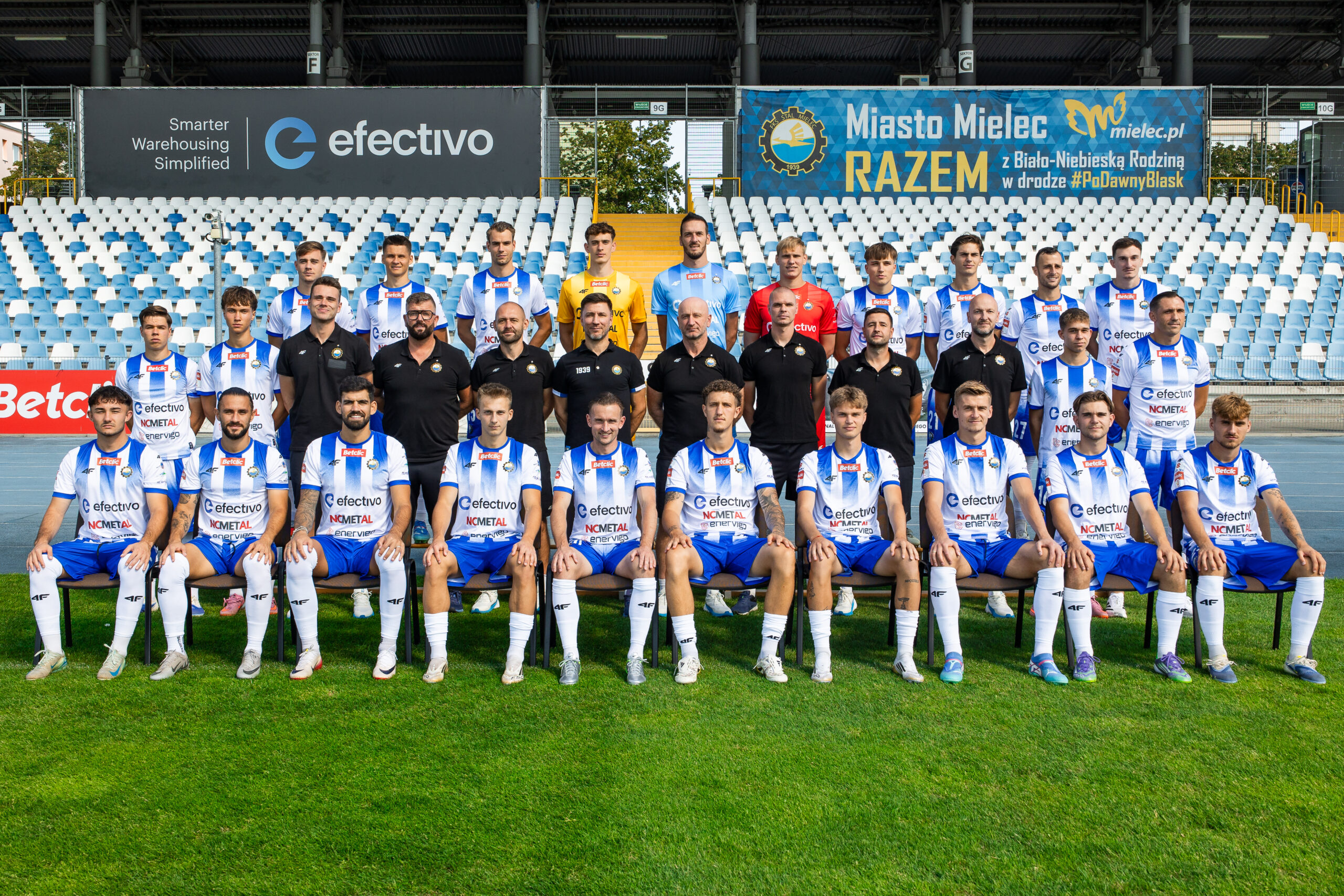 Duży plakat prezentujący kadrę drużyny FKS Stal Mielec w sezonie 2025/2026 Betclic 1 Ligi.