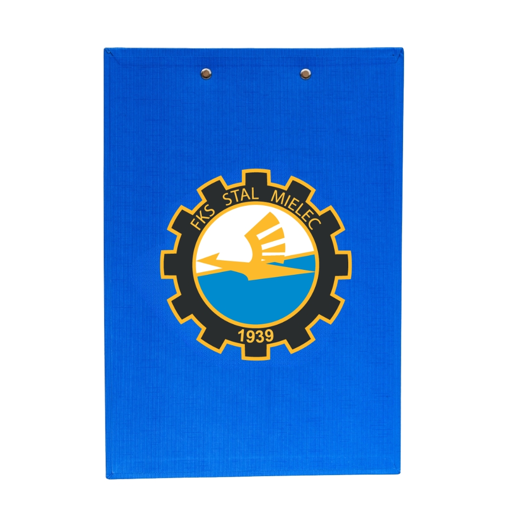 Podkładka wykonana z tektury pokrytej folią PVC z praktyczną okładką. Doskonale nadaje się do pracy w terenie lub jako podkład do robienia notatek podczas spotkań biznesowych, szkoleń i konferencji. Mocny klip z z mechanizmem sprężynowym oraz gumowymi narożnikami utrzymuje kartki nieruchomo. Pasuje na format A4. Z tyłu widoczny herb FKS Stal Mielec.
