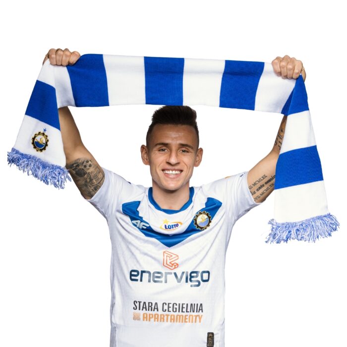 Najwyższej jakości dwustronny szalik typu pasiak z haftowanym herbem FKS Stal Mielec.