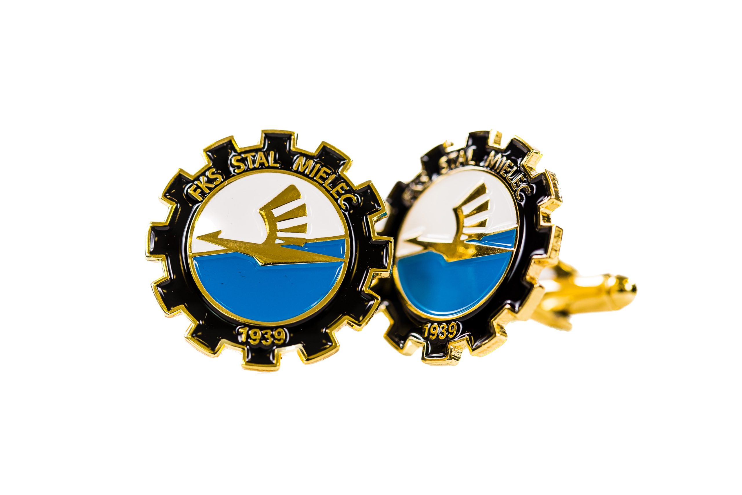 Spinki do mankietów przedstawiające herb FKS Stal Mielec w kolorze złotym.